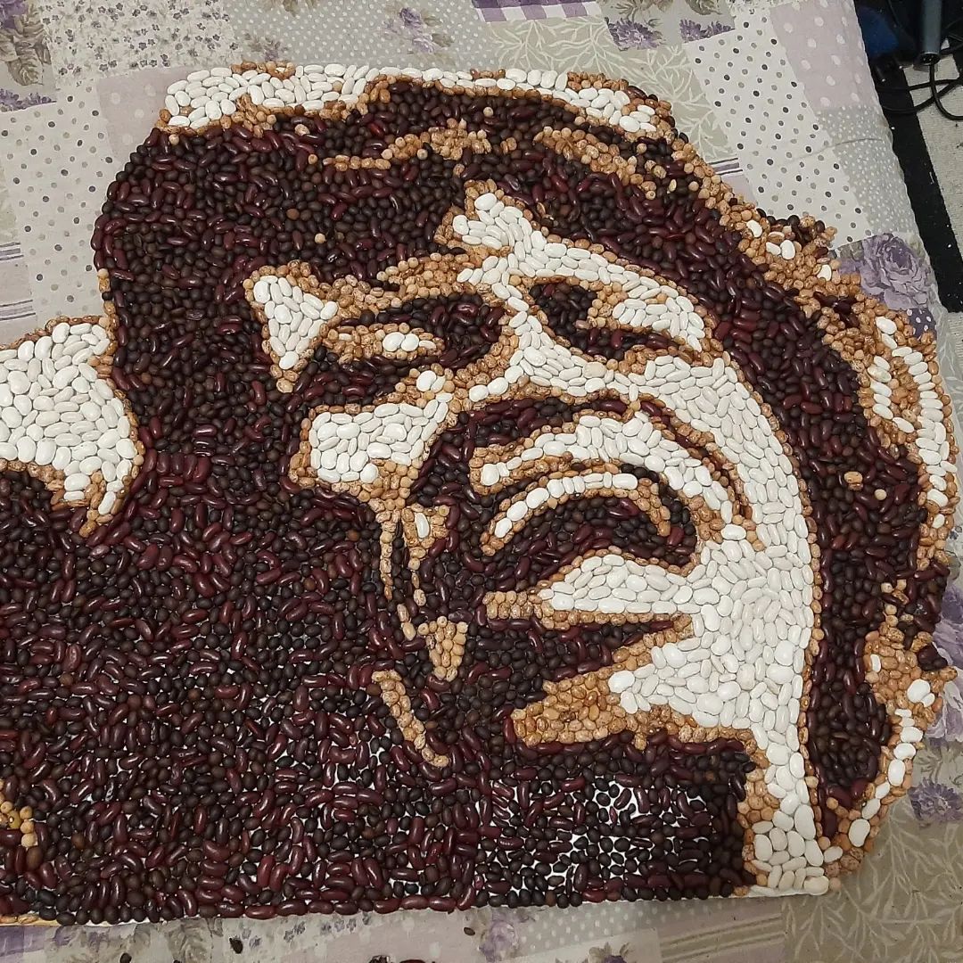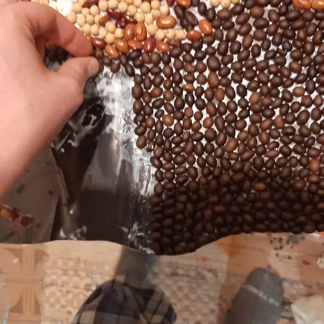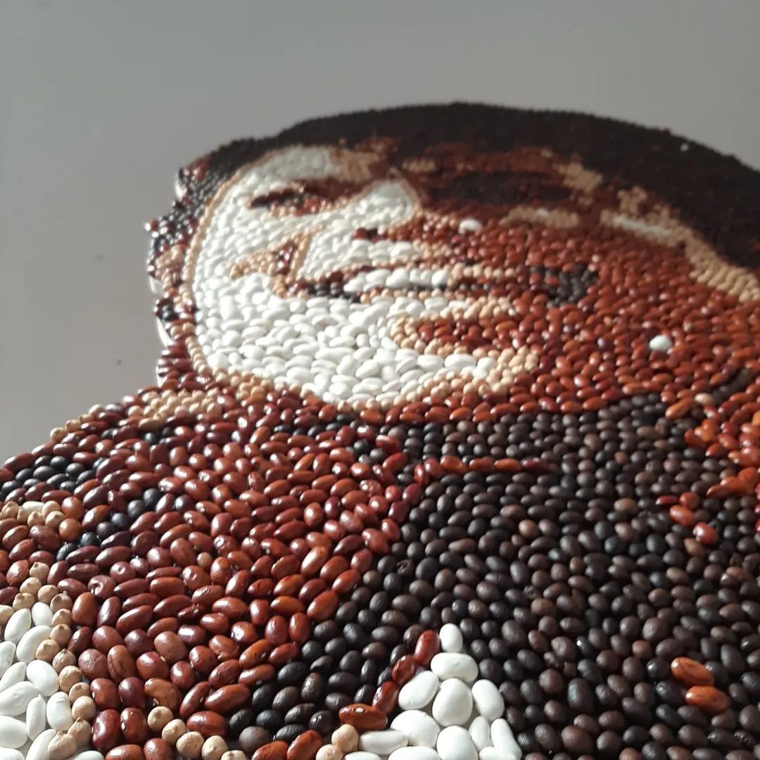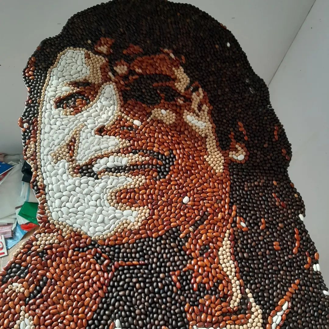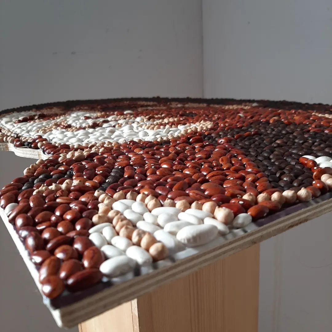 I use the technique of cutting with pliers and as materials tiles/ceramics, stone, colored glass, but also vegetable products for the vegetable mosaic version.