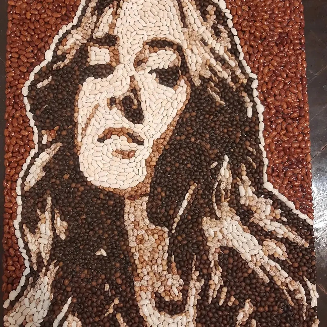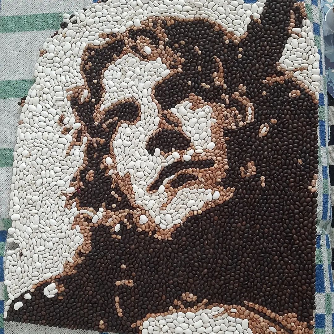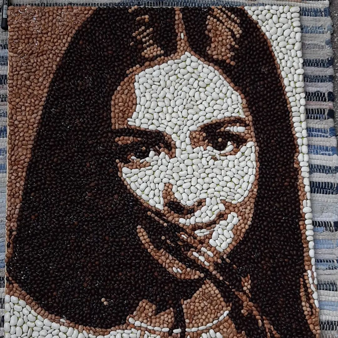 I use the technique of cutting with pliers and as materials tiles/ceramics, stone, colored glass, but also vegetable products for the vegetable mosaic version.